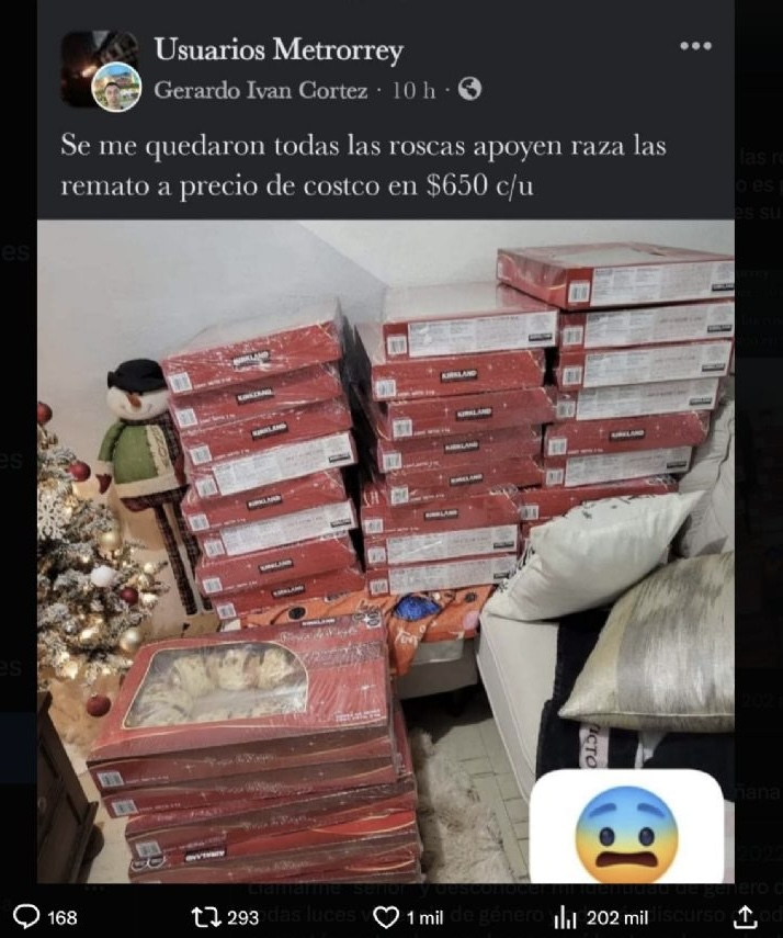 Uno de los casos más emblemáticos es el de Gerardo, un joven revendedor que, apenas el 5 de enero del 2024, anunciaba con entusiasmo en redes sociales la disponibilidad de decenas de roscas del Costco. En su publicación, ofrecía la posibilidad de apartar una rosca por 150 pesos, con la promesa de entregarla por 900 pesos al día siguiente. Incluso, advertía que los precios de reventa podrían llegar hasta los mil 200 pesos.