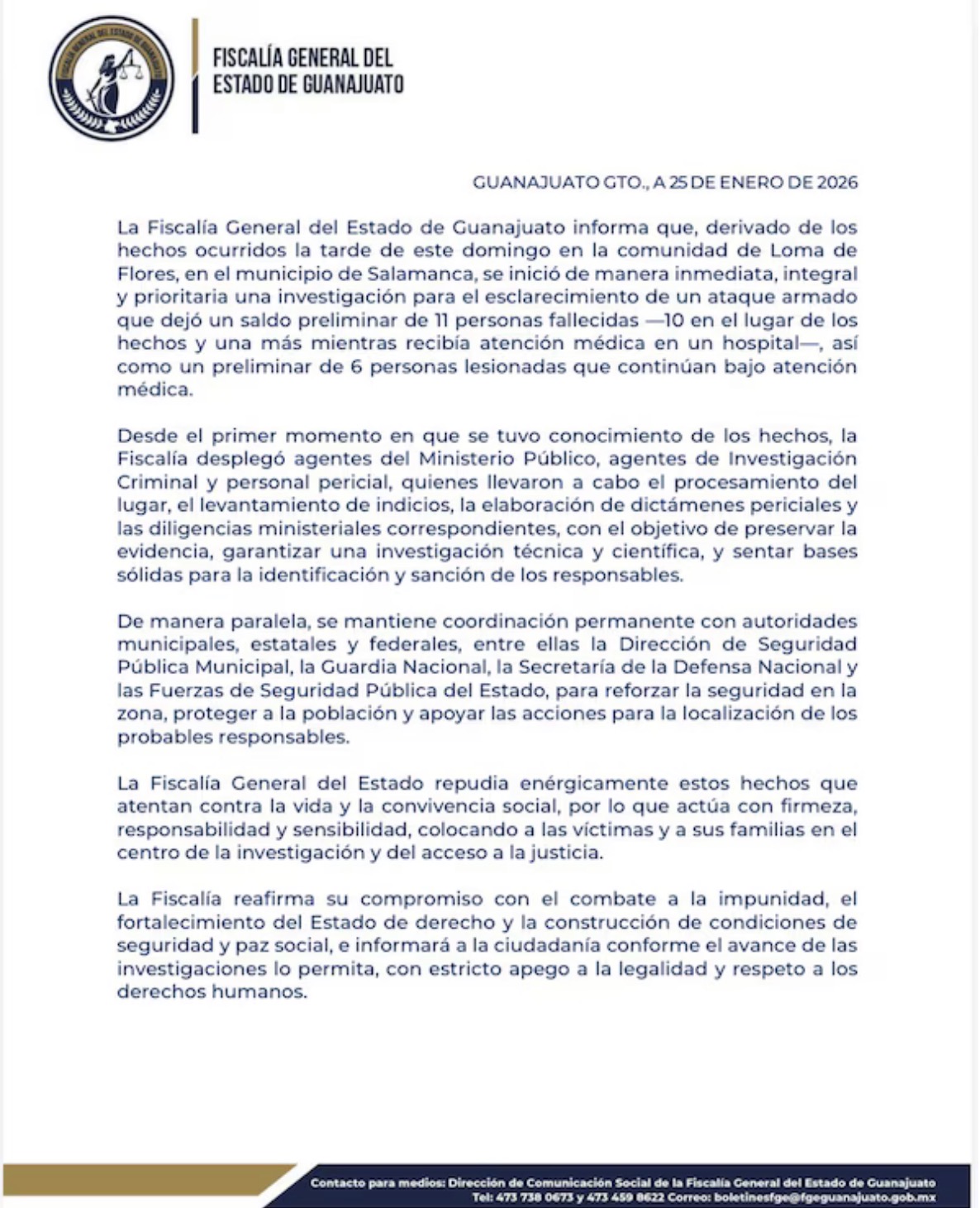En un comunicado oficial, el Gobierno Municipal de Salamanca, encabezado por el alcalde César Prieto, condenó los hechos y confirmó el saldo de 11 personas fallecidas y 12 lesionadas, cifra que difiere de la reportada por la Fiscalía estatal, la cual informó de 6 personas heridas de manera preliminar.