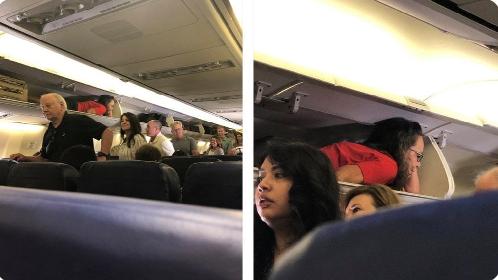 El breve video muestra a una mujer acostada boca abajo, mientras se encontraba dentro de uno de los compartimientos superiores del avión, destinados al equipaje de mano.