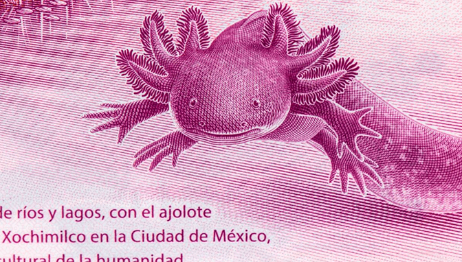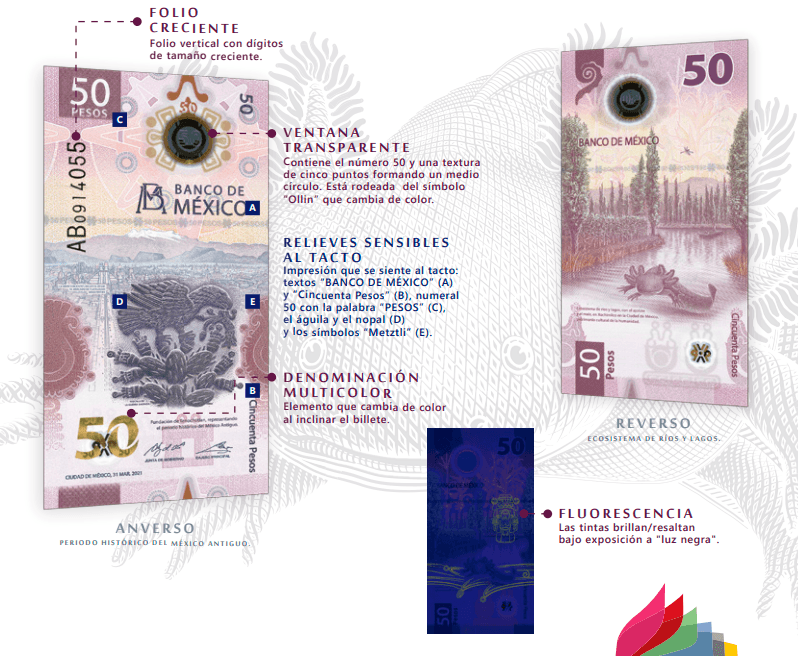 El billete de 50 pesos con la imagen del ajolote es particularmente susceptible a la falsificación debido a su popularidad y alta demanda en el mercado. Este billete, que ha recibido elogios a nivel mundial por su diseño creativo, ha sido objeto de concursos internacionales de diseño de billetes.