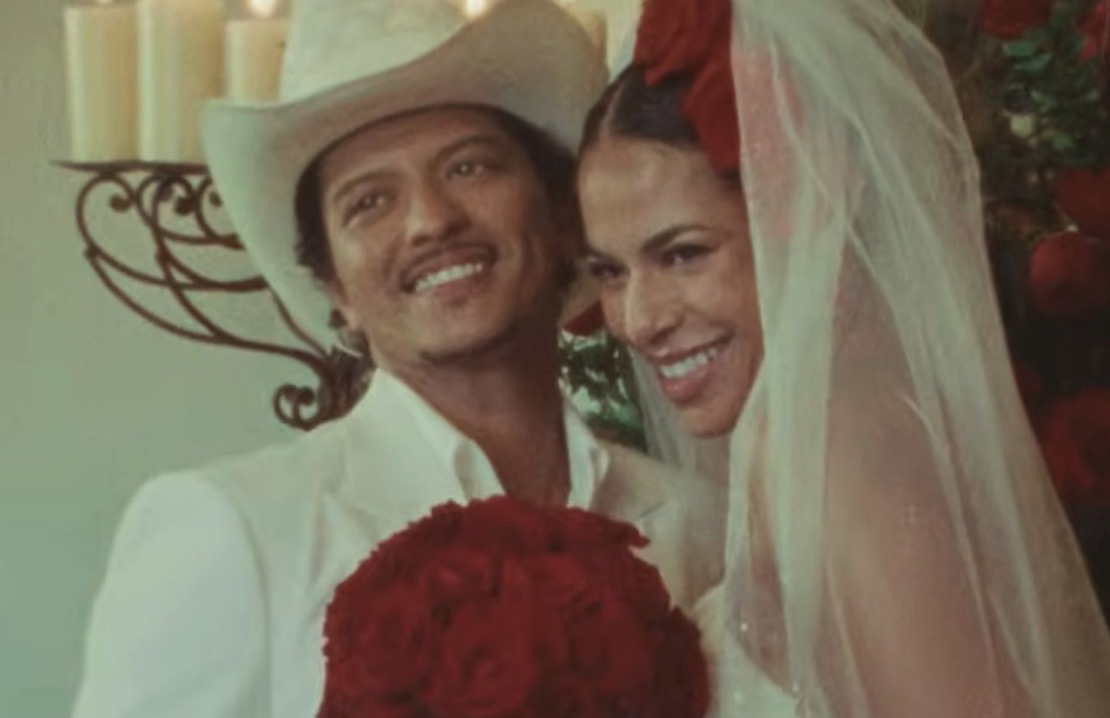 Mars aparece ataviado con traje blanco y sombrero de charro, mientras detalles como rosas rojas, cadenas con la imagen de la Virgen de Guadalupe y elementos religiosos refuerzan la atmósfera. La narrativa gira en torno a la promesa de “arriesgarlo todo” por amor.