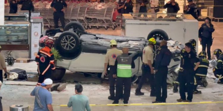 Una camioneta blanca cayó desde el segundo piso de la Plaza Lilas, ubicada en la alcaldía Cuajimalpa, durante la mañana de este sábado 24 de mayo. De acuerdo con información preliminar, una mujer de 60 años se encontraba a bordo del vehículo al momento del accidente.