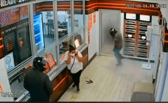 Las imágenes de las cámaras de vigilancia mostraron al menos a tres personas en una pizzería que fueron sorprendidas por el ataque armado.