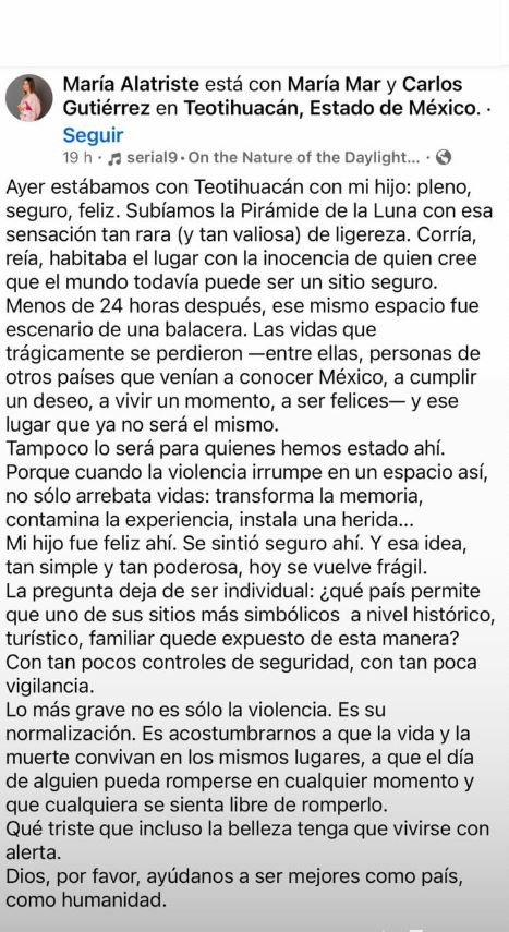 El mensaje fue compartido por una mujer que relató su experiencia al visitar la Pirámide de la Luna junto a su hijo, apenas un día antes de la balacera que dejó víctimas y encendió las alertas sobre la seguridad en el sitio.