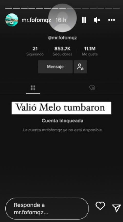 «Me tumbaron el TikTok, entonces ahora estoy usando la cuenta de respaldo. Ya casi éramos el millón y que lo tumban, pero bueno estoy usando la de respaldo, ya casi llega al medio millón. Vayan, denle apoyo”, dijo Fofo Márquez en una de sus historias de Instagram.