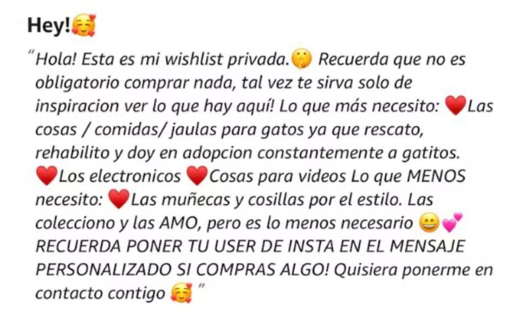 Sin embargo, la lista sorprendió por incluir artículos de alto costo, como una casa prefabricada de lujo valorada en más de 269 mil pesos, una cámara profesional de 128 mil pesos y una bicicleta eléctrica de más de 31 mil pesos. Grey justificó algunos de estos deseos al mencionar que necesita recursos para ayudar a gatos rescatados. “Lo que más necesito: las casas, comidas, jaulas para gatos ya que rescato, rehabilito y doy en adopción constantemente a gatitos, los electrónicos y cosas para videos”, señaló.