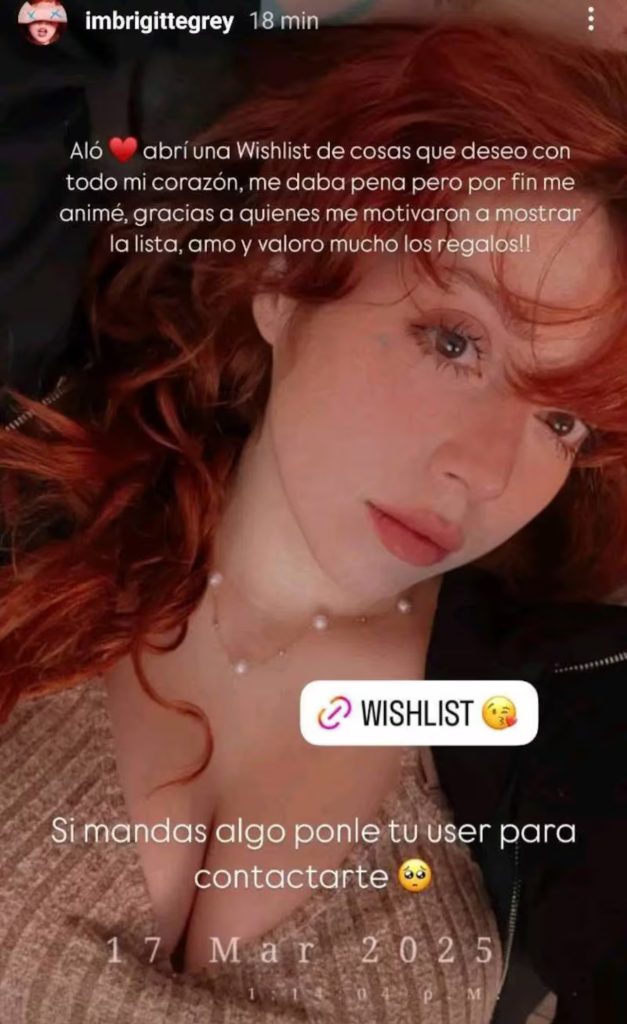En sus historias de Instagram, Grey explicó que había creado la lista con cosas que desea “con todo su corazón” y agradeció a quienes la motivaron a compartirla. “Abrí una wishlist con cosas que deseo con todo mi corazón, me daba pena, pero por fin me animé. Gracias a quienes me motivaron a mostrar la lista, ¡Amo y valoro mucho los regalos! Si mandas algo, ponle tu user para contactarte”, escribió la influencer, quien cuenta con más de 525 mil seguidores.