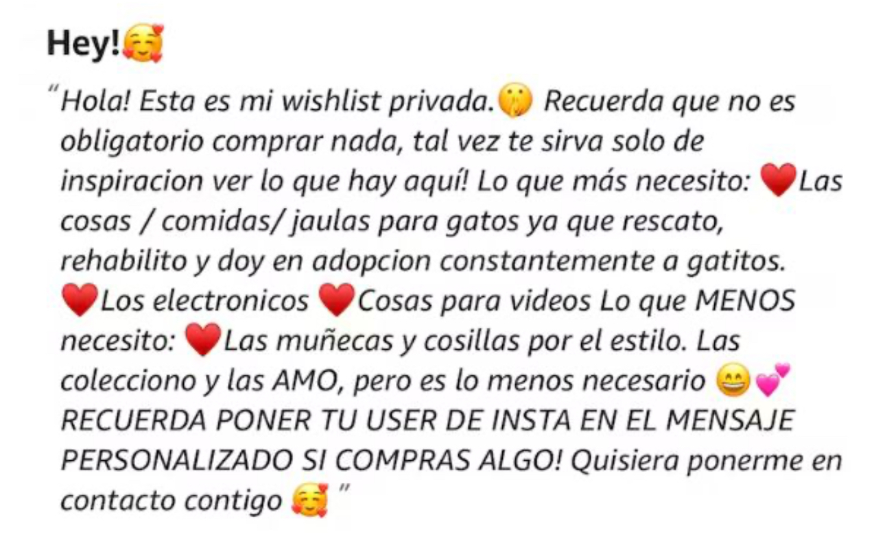 En sus historias de Instagram, Grey explicó que había creado la lista con cosas que desea “con todo su corazón” y agradeció a quienes la motivaron a compartirla. “Abrí una wishlist con cosas que deseo con todo mi corazón, me daba pena, pero por fin me animé. Gracias a quienes me motivaron a mostrar la lista, ¡Amo y valoro mucho los regalos! Si mandas algo, ponle tu user para contactarte”, escribió la influencer, quien cuenta con más de 525 mil seguidores.