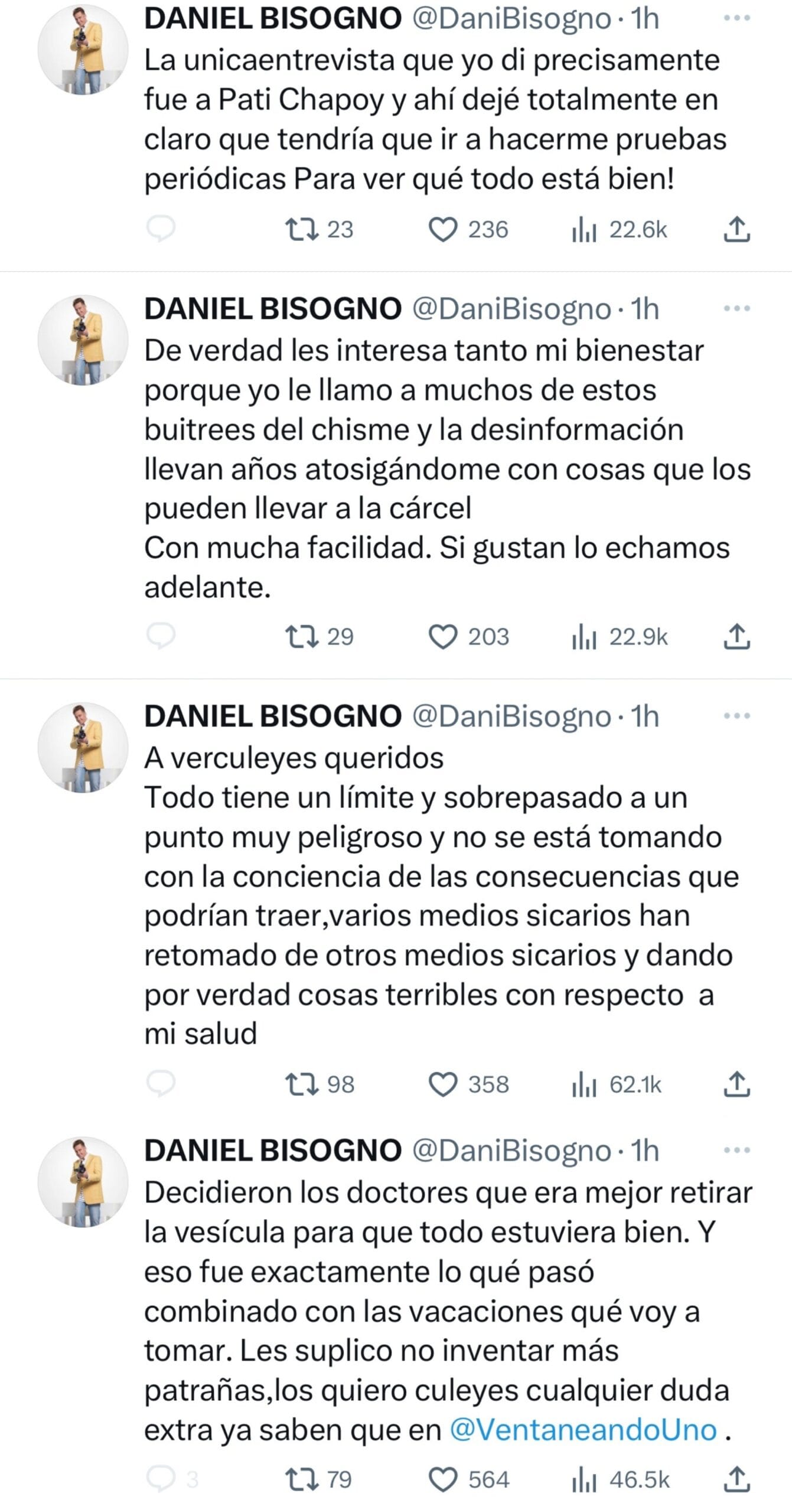 Visiblemente molesto, Daniel Bisogno expresó su preocupación por la forma en que algunos medios han manejado la información sobre su salud. Se refirió a ciertos medios como «buitres del chisme» y «medios sicarios» que han difundido noticias falsas y alarmantes sobre su estado de salud.