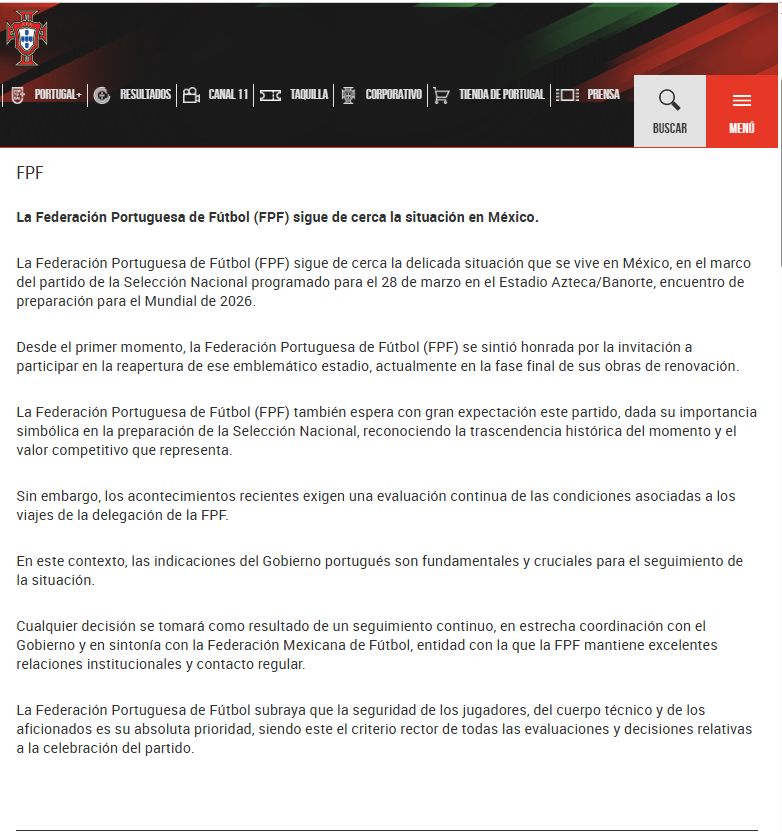 “La Federación Portuguesa de Futbol sigue de cerca la delicada situación que se vive en México, en el marco del partido de la Selección Nacional programado para el 28 de marzo en el Estadio Azteca/Banorte, encuentro de preparación para el Copa Mundial de la FIFA 2026”, señaló el organismo en su mensaje.