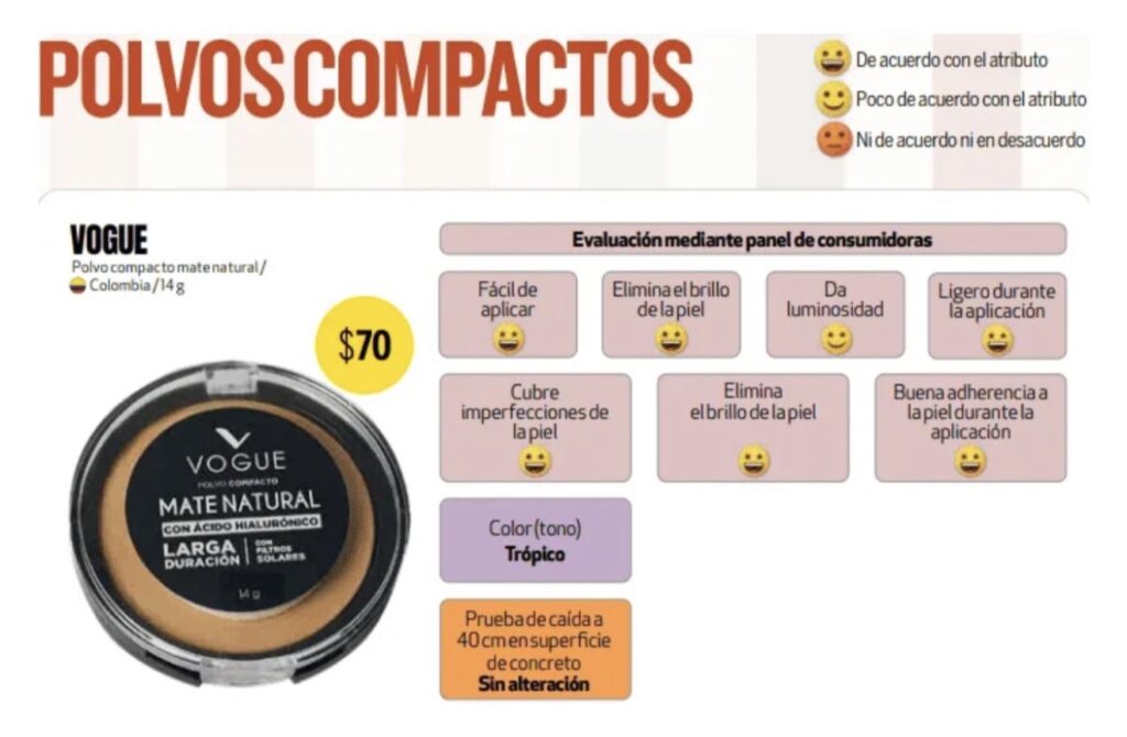 De acuerdo con Profeco, el polvo compacto es un cosmético diseñado para unificar el tono de la piel y reducir el brillo excesivo, por lo que debe cumplir con criterios como facilidad de aplicación, buena adherencia, cobertura adecuada y seguridad en sus componentes. En este análisis, la dependencia identificó como el maquillaje con ácido hialurónico más económico al polvo compacto de la marca Vogue, en su tono mate natural.