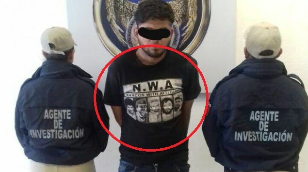 La playera con la leyenda «Narcos with Attitude» es un rediseño de la portada del álbum de hip hop de (NWA) Niggaz With Attitudes, conformoada por Arabian Prince, DJ Yella, Dr. Dre, Eazy-E, Ice Cube y MC Ren.
