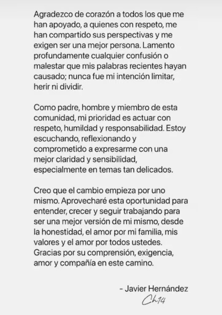 Javier Chicharito Hernández emitió este jueves un comunicado en sus historias de Instagram para disculparse tras las críticas generadas por sus polémicas declaraciones sobre el rol de la mujer, que tacharon de machistas y que incluso recibieron señalamientos de la presidenta Claudia Sheinbaum y del equipo femenil de Chivas.