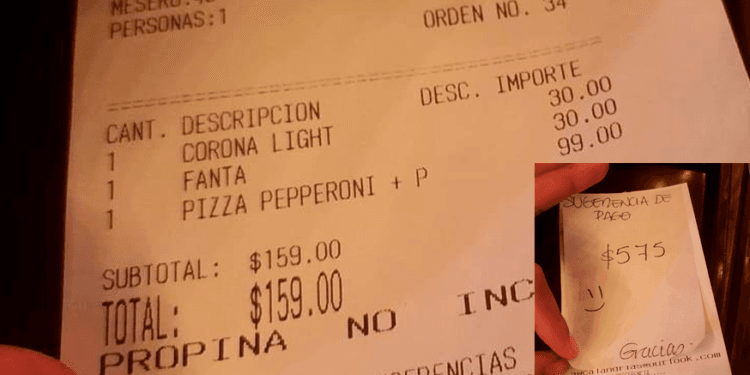 El incidente se dio a conocer a través de X (anteriormente Twitter) cuando un usuario compartió imágenes de un ticket de restaurante que mostraba una sugerencia de pago por parte del mesero que excedía ampliamente el costo de los alimentos consumidos.