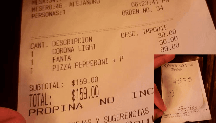El incidente se dio a conocer a través de X (anteriormente Twitter) cuando un usuario compartió imágenes de un ticket de restaurante que mostraba una sugerencia de pago por parte del mesero que excedía ampliamente el costo de los alimentos consumidos.
