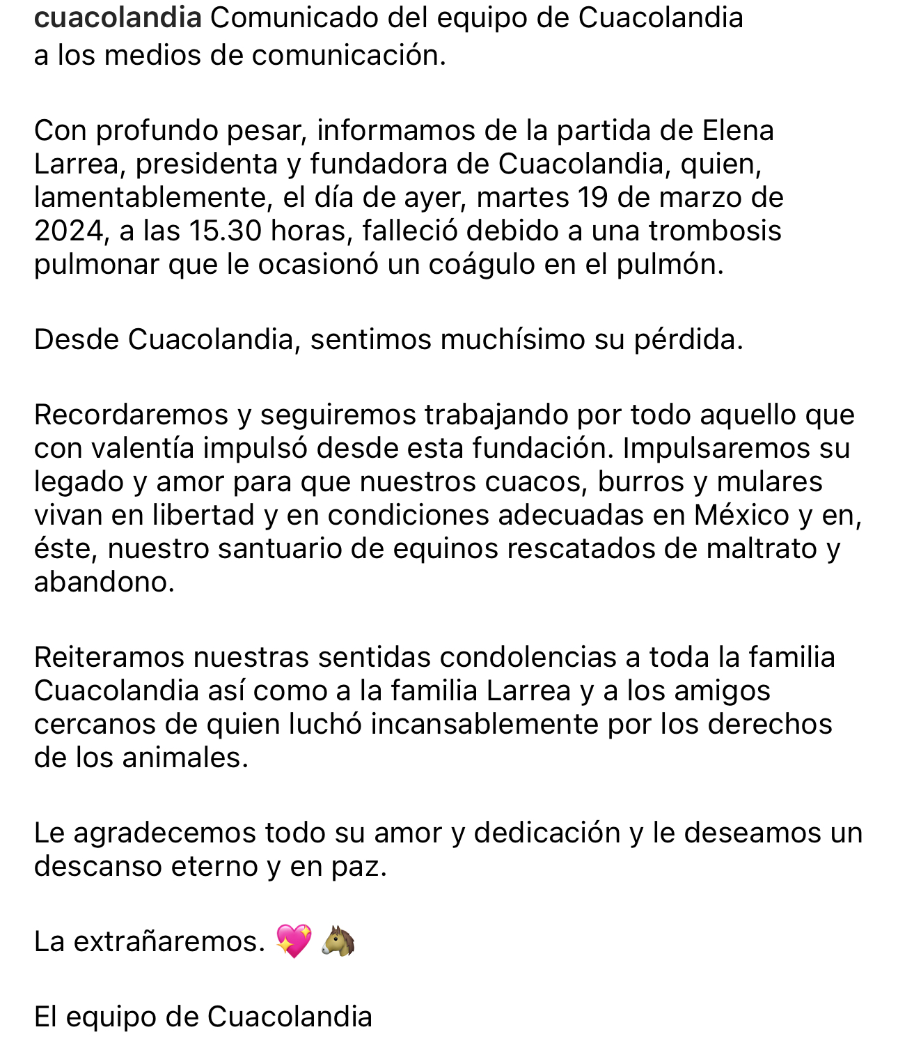 El deceso de Larrea ha generado un torrente de condolencias en las redes sociales, donde usuarios y diversas cuentas dedicadas a la defensa de los derechos de los animales expresaron su sorpresa y pesar ante la noticia. Aunque aún no se han emitido declaraciones oficiales por parte de su santuario, Cuacolandia, o de sus redes personales, el impacto de su pérdida se ha hecho sentir profundamente.