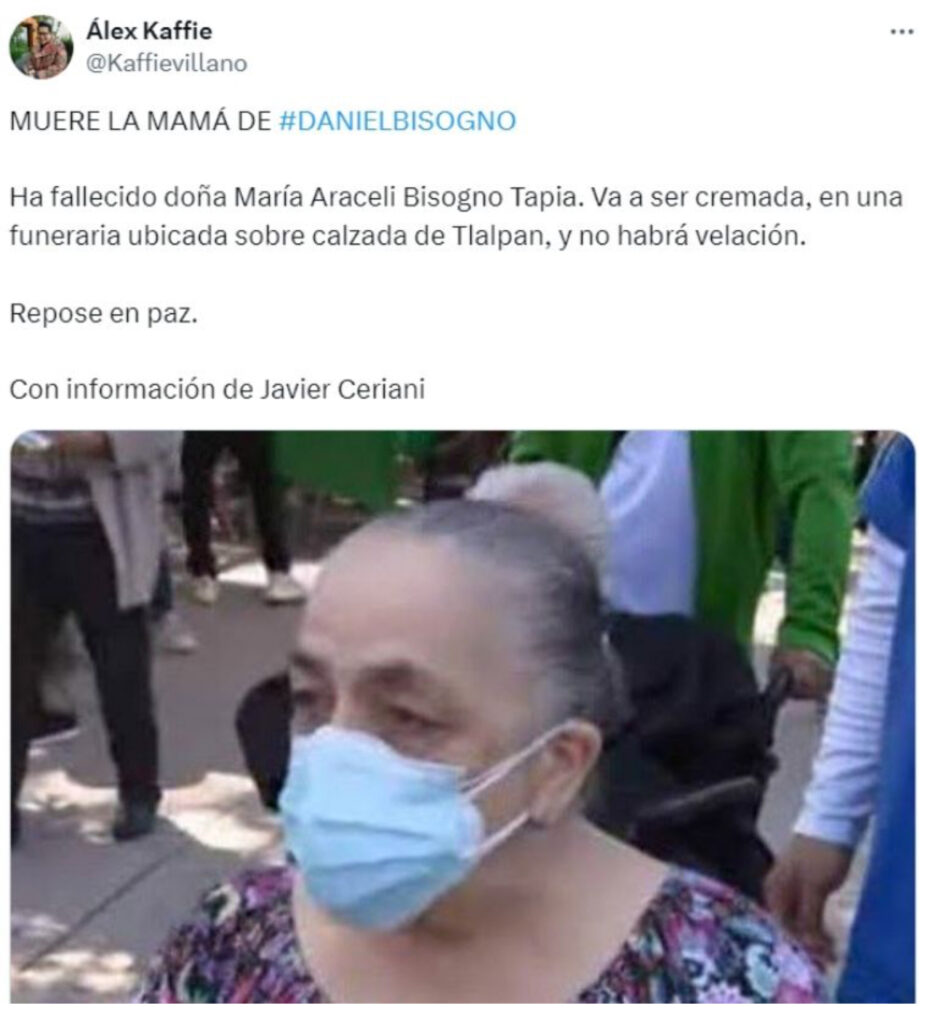 Según información proporcionada por Alex Kaffie, la madre de Daniel Bisogno será cremada en una funeraria ubicada en la alcaldía Tlalpan en la Ciudad de México. Al parecer, no se llevarán a cabo servicios funerarios, y la familia no ha brindado más detalles sobre la situación.