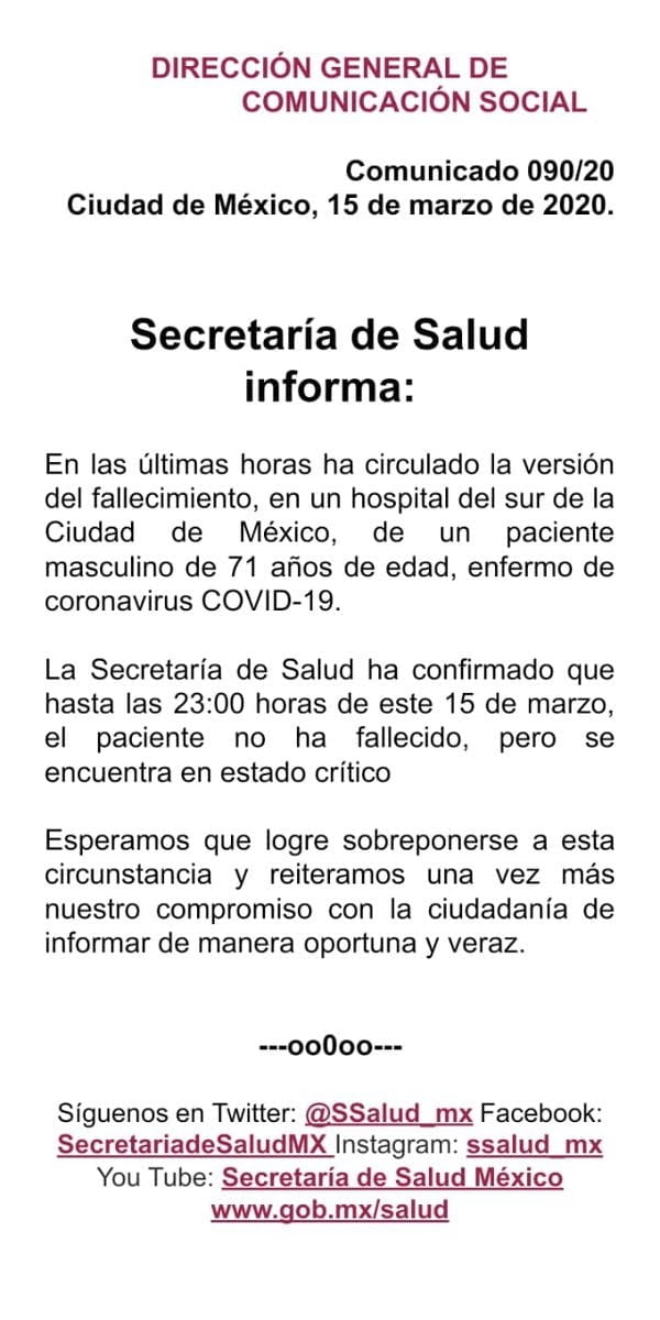 Además, desde la cuenta oficial de la Secretaría de Salud, se desmintió la noticia a través de un comunicado.