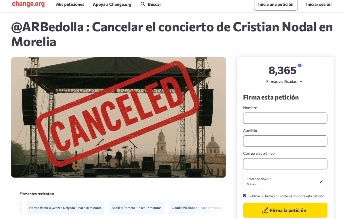 La presencia de Christian Nodal en las celebraciones del 15 de septiembre en Morelia, organizada por el Gobierno de Michoacán, ha desatado un fuerte debate público. Colectivos feministas y ciudadanos han lanzado una petición en Change.org para exigir que se cancele la presentación del cantante durante las Fiestas Patrias, argumentando que resulta inadmisible financiar con recursos públicos a un artista señalado de violencia vicaria y económica.