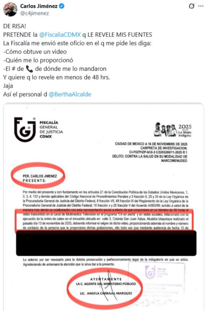 El propio Jiménez reveló el oficio a través de su cuenta de X, donde calificó el requerimiento como un intento de presión. La solicitud fue emitida tres días después de que difundiera material relacionado con un operativo en Iztapalapa.