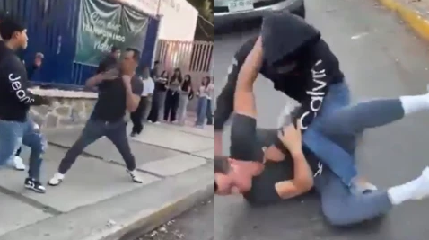 Las imágenes, grabadas por testigos, muestran el momento en que un joven y un hombre adulto se enfrentan a golpes en plena vía pública, justo frente al plantel educativo ubicado en Guadalajara, Jalisco.