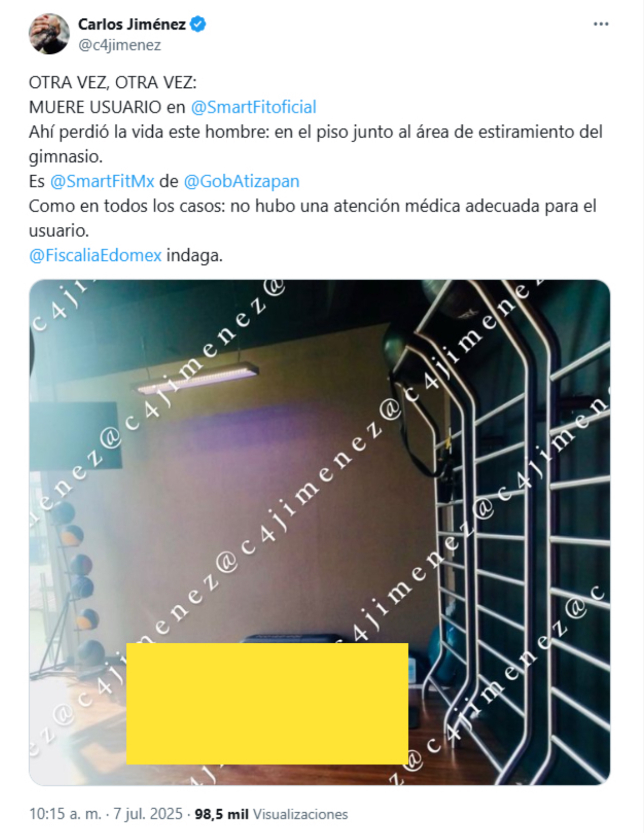 Un hombre falleció este día al interior de un gimnasio Smart Fit ubicado en la alcaldía Atizapán de Zaragoza, en la Ciudad de México, según reportó el periodista Carlos Jiménez. El deceso ocurrió en la zona de estiramientos del establecimiento, donde la víctima no recibió atención médica inmediata.