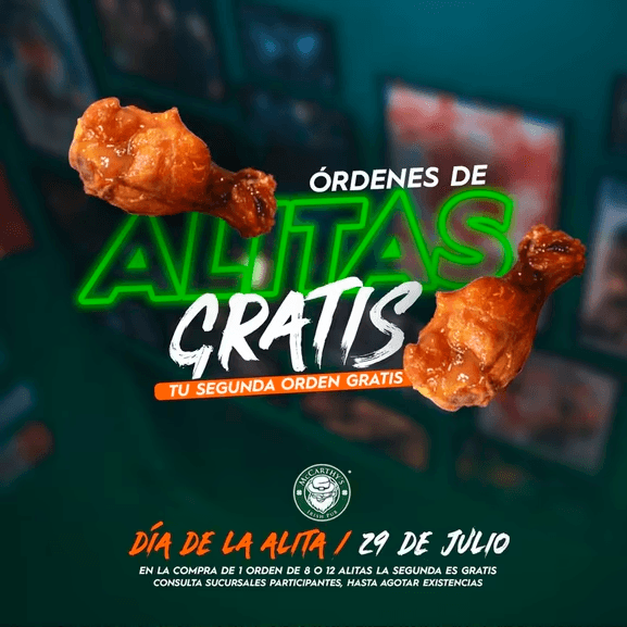 En la compra de una orden de 8 o 12 alitas recibe gratis la segunda.
