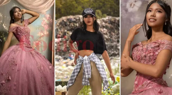 Como parte de la preparación para su segunda fiesta, un fotógrafo local le regaló una sesión especial donde no solo luce su vestido rosa, sino también atuendos urbanos, posando con orgullo en el basurero donde ella y su familia trabajan desde hace años.