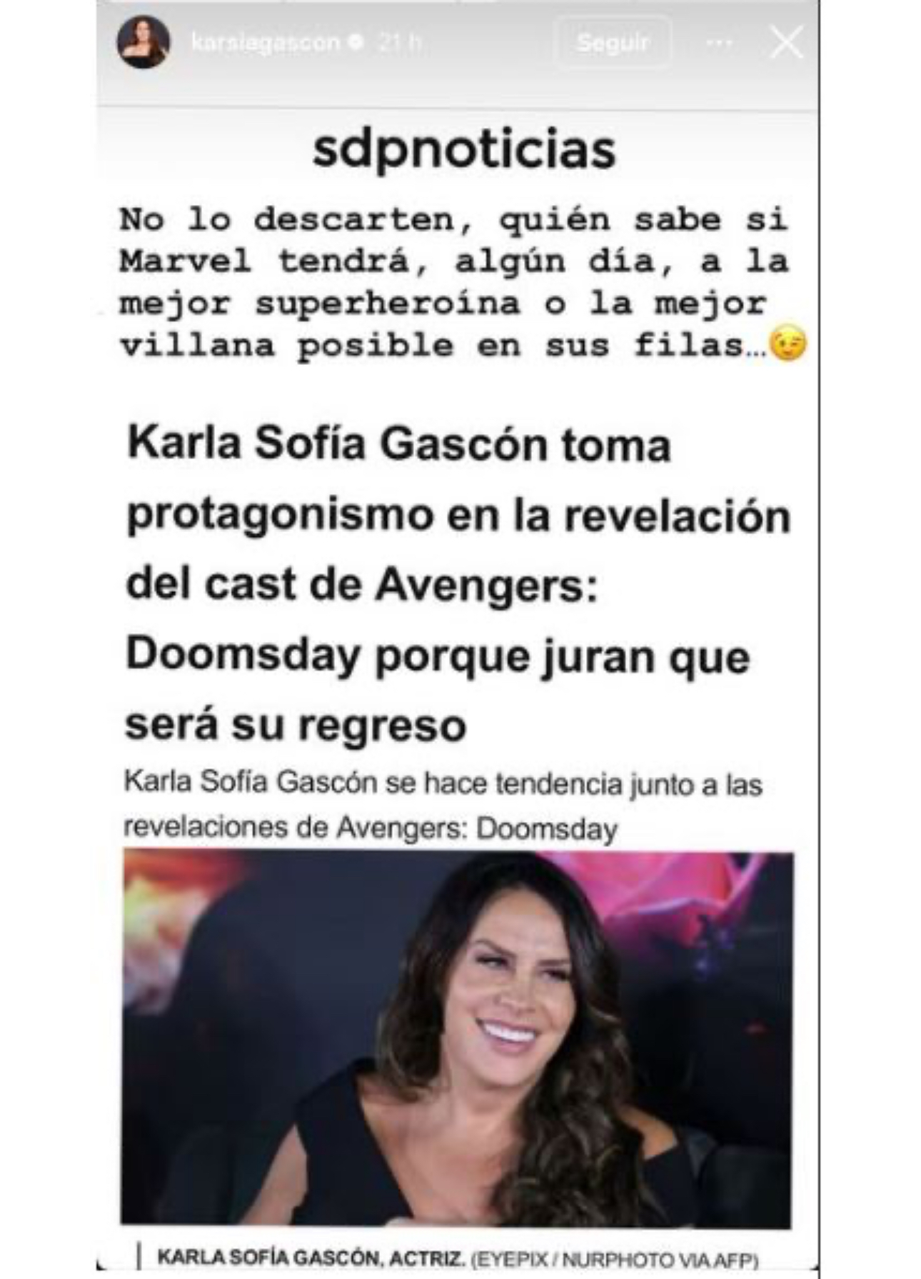 «Avengers: Doomsday» se estrenará en 2026, pero la expectativa ya está más que encendida. ¿Será Karla Sofía Gascón la próxima sorpresa de Marvel? Solo el tiempo lo dirá.