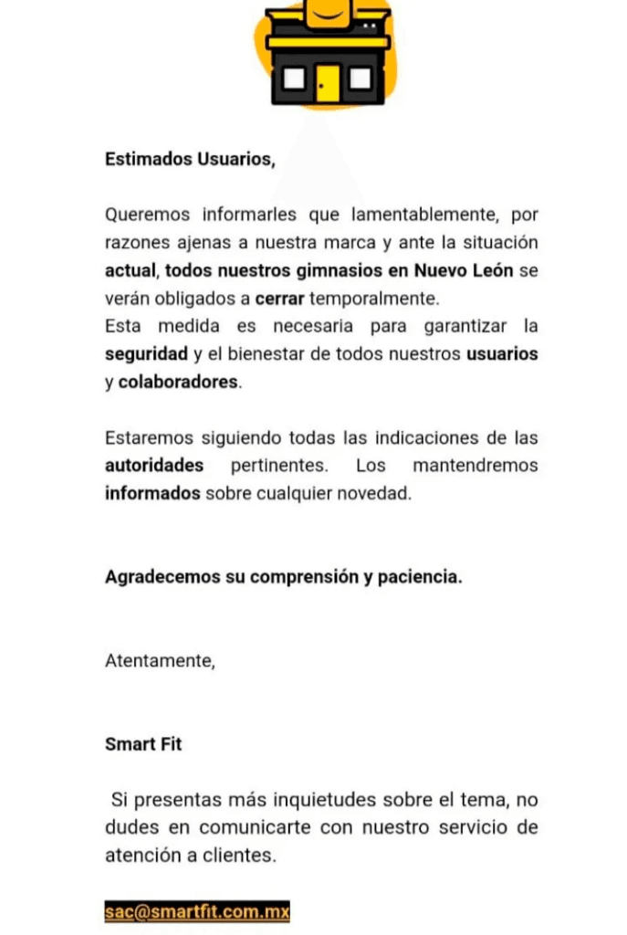 «Estimados usuarios, queremos informales que lamentablemente, por razones ajenas a nuestra marca y ante la situación actual, todos nuestros gimnasios en Nuevo León se verán obligados a cerrar temporalmente.