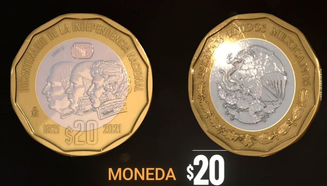 Moneda de cuño corriente: al centro, las efigies de Miguel Hidalgo, José María Morelos y Vicente Guerrero de perfil hacia la izquierda. En la parte superior, el Ángel de la Independencia como imagen latente, y a la izquierda, el micro texto “LIBERTAD”. En el borde superior, la leyenda “BICENTENARIO DE LA INDEPENDENCIA NACIONAL”. En el exergo, la denominación “$20” con los años “1821” a la izquierda y “2021” a la derecha. A la izquierda, la ceca de la Casa de Moneda de México “M°”. Moneda de plata: al centro, las efigies de perfil de Miguel Hidalgo, José María Morelos y Vicente Guerrero. A la izquierda, el perfil de la Victoria Alada que remata el Ángel de la Independencia. En la parte superior, siguiendo el contorno, la leyenda “BICENTENARIO DE LA INDEPENDENCIA NACIONAL”. La denominación “$10” en el exergo, el año “1821” a la izquierda, y el año “2021” y la ceca de la Casa de Moneda de México “M°” a la derecha.