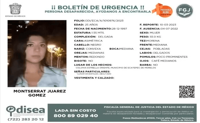 La misteriosa historia de Montserrat Juárez Gómez, una joven de 24 años en ese momento, ha dado un escalofriante giro que ha dejado perplejas a las autoridades y la sociedad en México. Montserrat había sido reportada como desaparecida desde el 4 de julio de 2022, cuando se encontraba en la colonia Jardines de Santa Clara, en Ecatepec de Morelos, Estado de México. Sin embargo, lo sorprendente es que la joven, en un giro insólito, aparentemente se presentó ante las autoridades para retirar su propio reporte de desaparición.