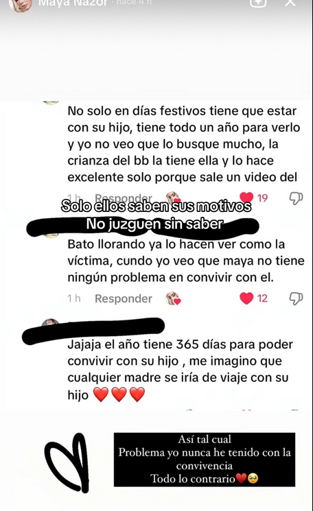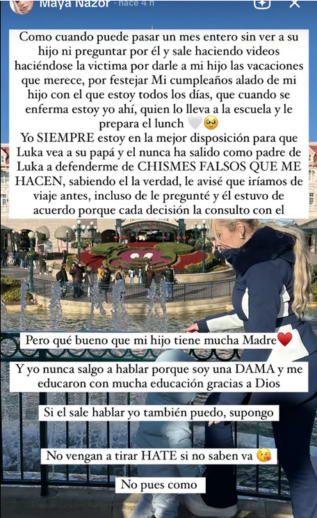 Por su parte, Maya Nazor compartió un mensaje contundente en respuesta a las críticas: “Como cuando puede pasar un mes entero sin ver a su hijo, ni preguntar por él y sale haciendo videos haciéndose la víctima por darle a mi hijo las vacaciones que se merece, por festejar mi cumpleaños a lado de mi hijo…”.