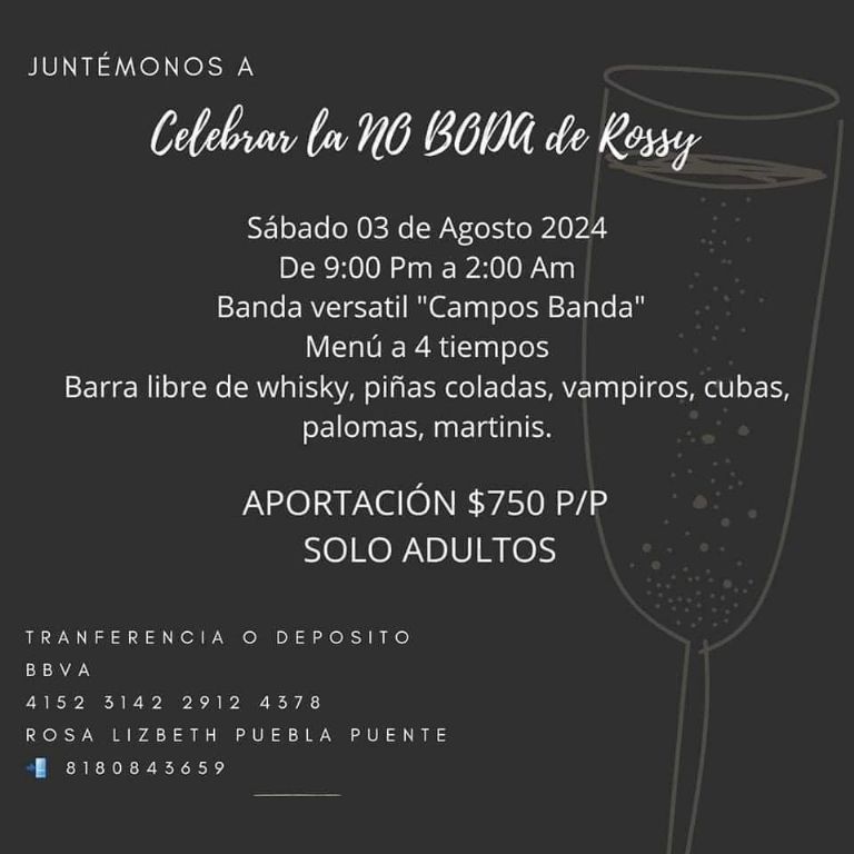 Después de cancelar su boda, Rossy decidió no dejar que la infidelidad la destrozara y optó por recuperar la inversión organizando una fiesta abierta al público bajo el lema «No boda». Utilizando sus redes sociales, difundió una invitación digital con la temática «No boda», invitando a la comunidad regiomontana a unirse a la celebración. Con un aporte de 750 pesos por persona, los asistentes podrán disfrutar de un menú a cuatro tiempos, barra libre de bebidas y la participación del grupo musical «Campos Banda».