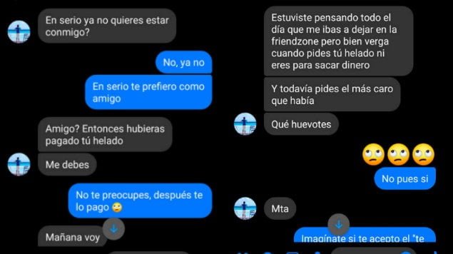 En la conversación que compartió, se puede ver que el joven, claramente molesto porque la chica le dijo que solo lo quiere como amigo, cobrándole lo que se gastó en el helado.