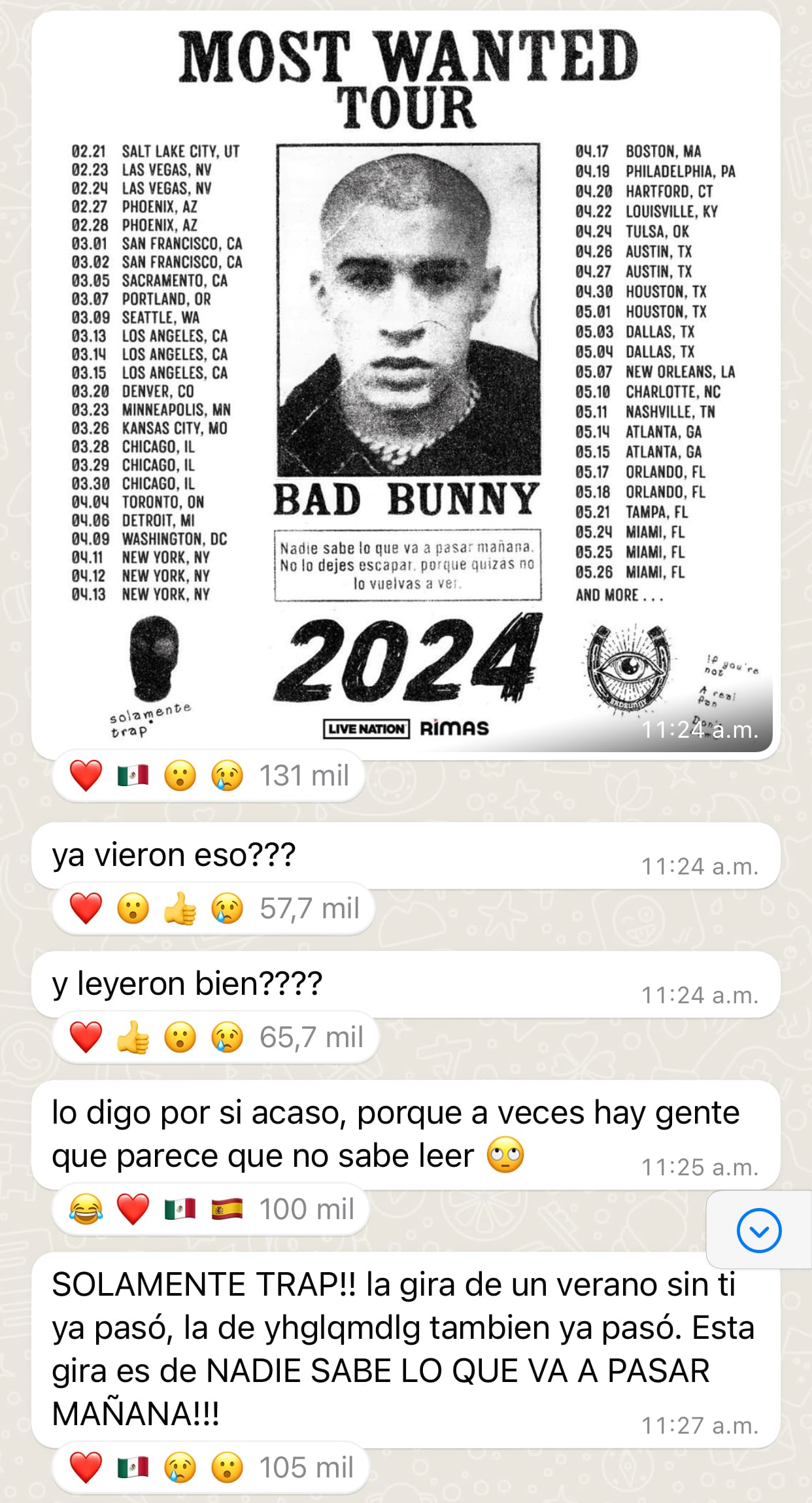 SOLAMENTE TRAP!! la gira de un verano sin ti ya pasó, la de yhglqmdlg tambien ya pasó. Esta gira es de NADIE SABE LO QUE VA A PASAR MAÑANA!!!”, escribió Bad Bunny en su canal de Telegram.