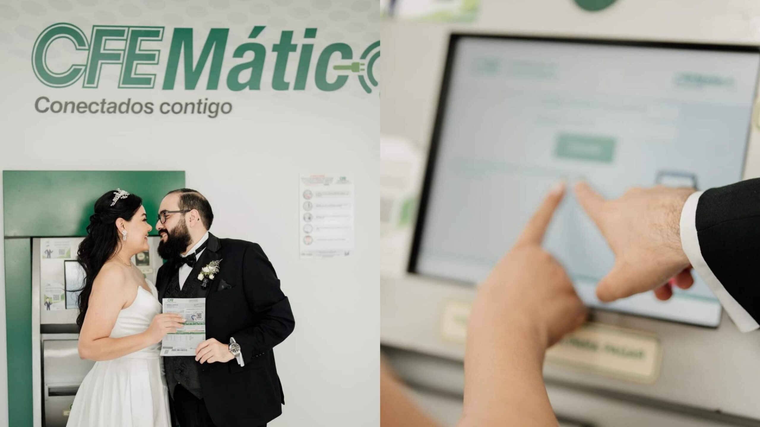 Las imágenes muestran a la pareja posando en diferentes partes de la sucursal de la CFE: en una de ellas, se les ve sonrientes al exterior de las oficinas, en otra pagan su recibo de luz y finalmente, posan juntos sosteniéndolo con alegría.