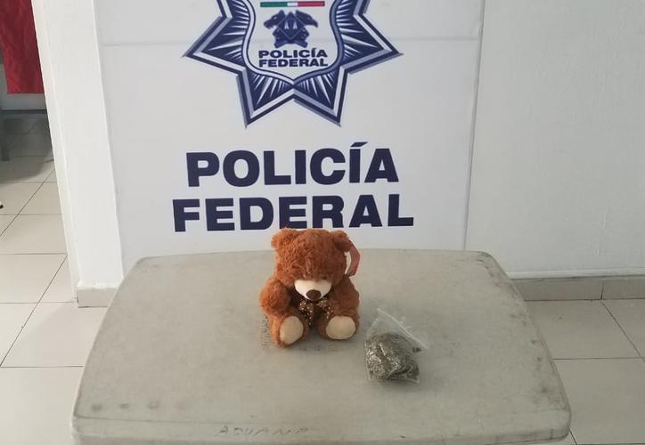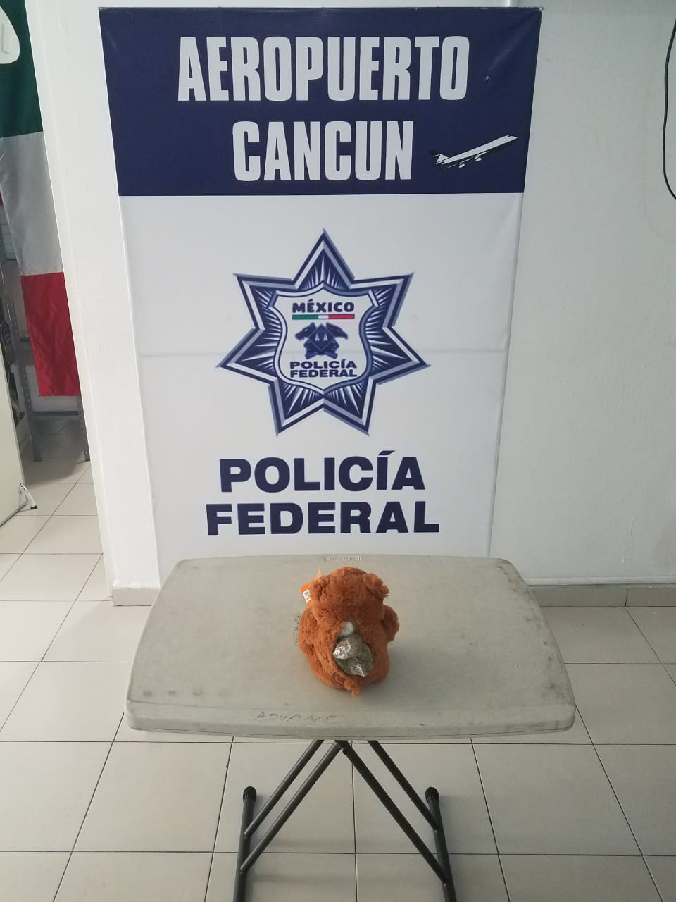 Esta mañana se descubrió un oso de peluche que contenía marihuana en su interior en una oficina de paquetería en el Aeropuerto de Cancún, Quintana Roo, gracias a un binomio canino.