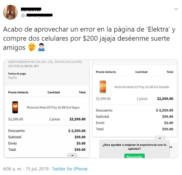 Varias personas aprovecharon este error para realizar sus compras e incluso recibieron los correos de confirmación, pero durante la madrugada el personal de Elektra se percató del error y dieron de baja la publicación