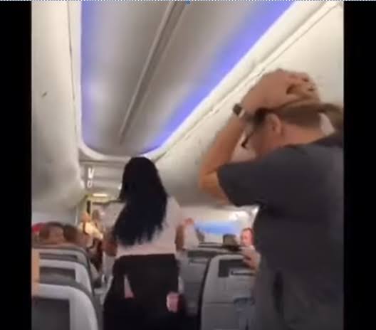 Una de las azafatas intenta tranquilizar a la mujer, haciéndole saber que hay un menor en el asiento de atrás, a lo que ella responde estar al tanto de la presencia de este.
