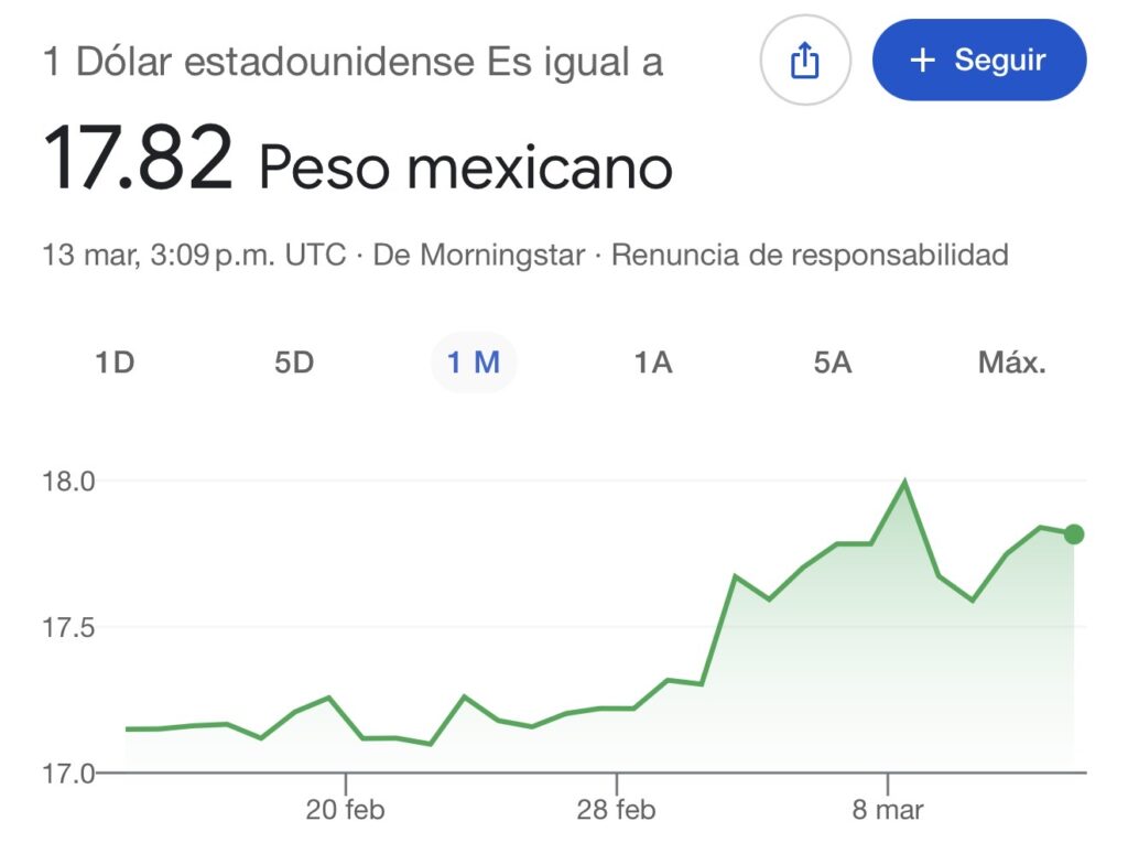 El precio del dólar en México registra movimientos en los mercados financieros este viernes 13 de marzo de 2026, con un tipo de cambio promedio de aproximadamente 17.84 pesos por dólar, de acuerdo con datos del mercado cambiario.