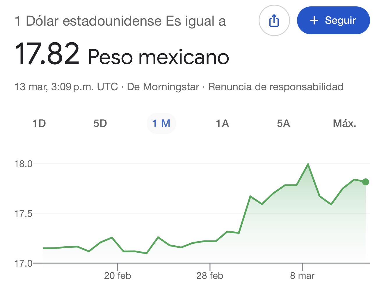 El precio del dólar en México registra movimientos en los mercados financieros este viernes 13 de marzo de 2026, con un tipo de cambio promedio de aproximadamente 17.84 pesos por dólar, de acuerdo con datos del mercado cambiario.