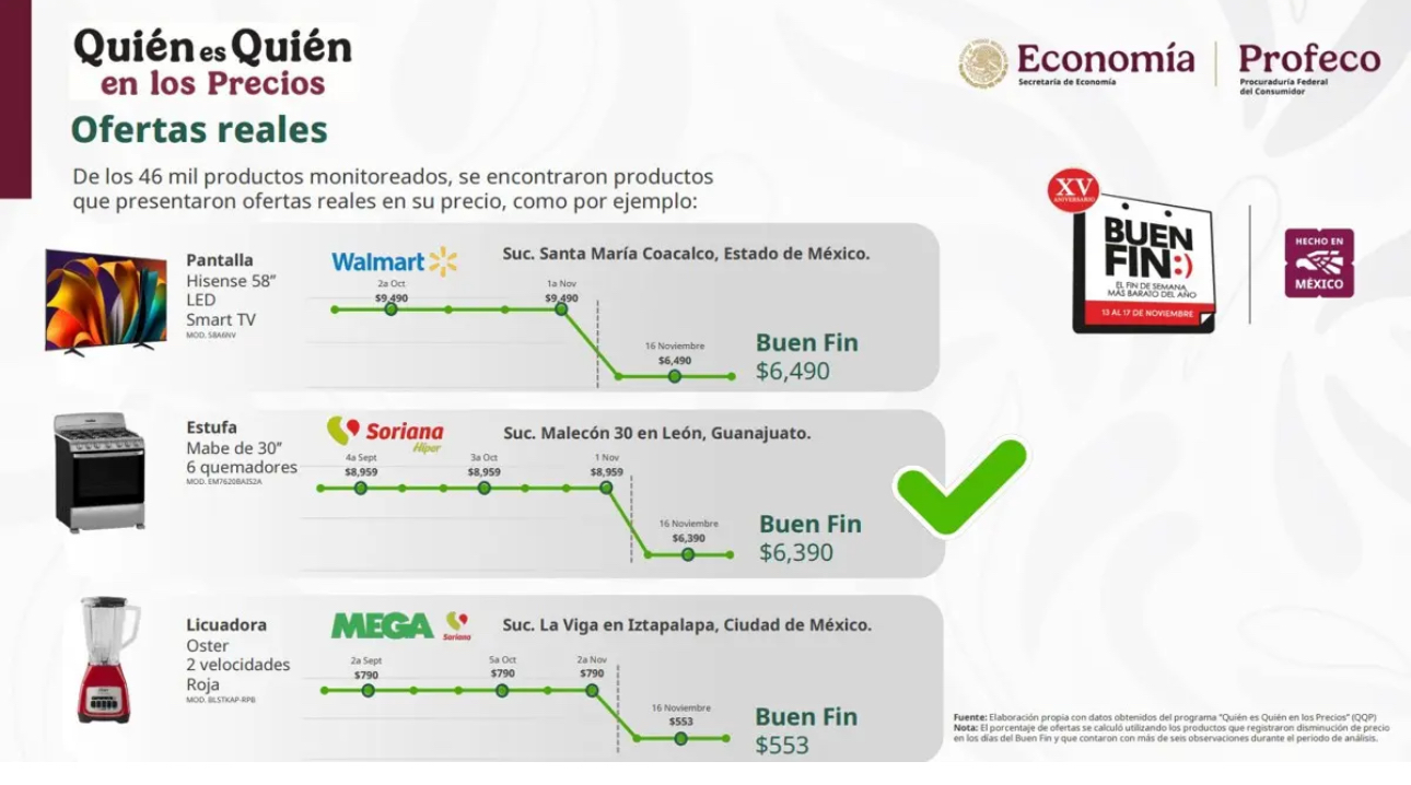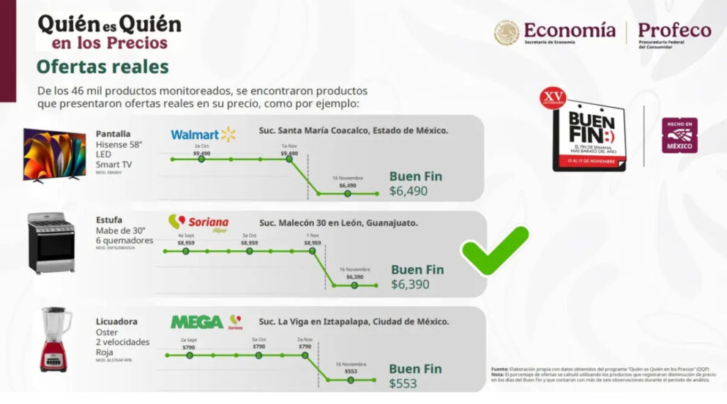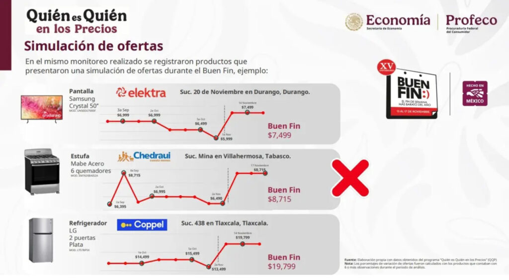 Durante su informe también destacó el caso de una pantalla de 50 pulgadas en Elektra Durango, donde el precio se mantuvo bajo previo al Buen Fin y aumentó durante la venta, simulando un descuento inexistente. Esta acción fue clasificada formalmente como simulación de oferta en el reporte oficial.