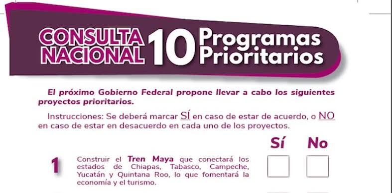 En una consulta binaria, los mexicanos podrán decidir si se echan a andar 10 proyectos en los próximos 6 años, entre los cuales resaltan el tren maya, una refinería en Tabasco y unas vías del tren que conectarán el Océano Pacífico y el océano Atlántico.