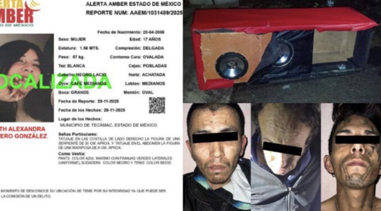 Las indagatorias llevaron a las autoridades a ejecutar un cateo en el Fraccionamiento Ex Hacienda de Paula, en Temascalapa, como parte de la orden número 000077/2025. Durante el operativo, agentes de la Fiscalía Especializada en Personas Desaparecidas localizaron a la joven dentro de un bafle, donde tres sujetos la mantenían privada de su libertad. Los detenidos fueron identificados como Edgar Ricardo ‘N’, Martín Gerardo ‘N’ y César Alberto ‘N’, este último conocido de la menor.