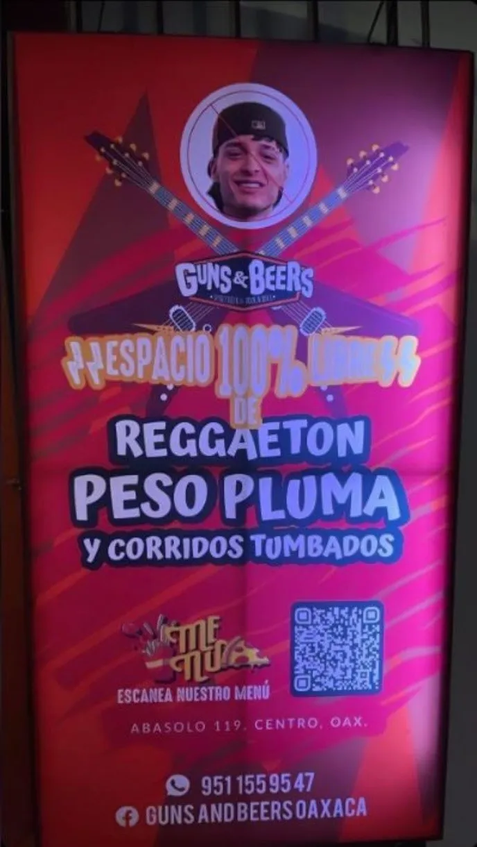 Guns & Beers, el establecimiento ubicado en Oaxaca, se ha propuesto ofrecer a sus clientes una experiencia musical sin la presencia de estos géneros, llegando al extremo de mostrar el rostro de Hassan Kabande, conocido como Peso Pluma, con una cruz sobre él para dejar en claro su prohibición en el lugar.