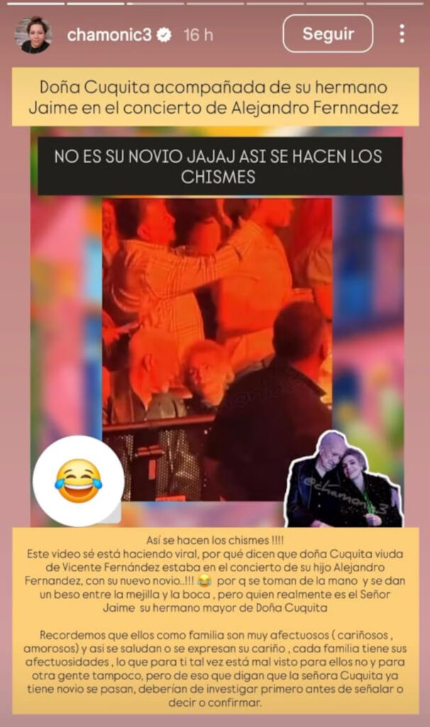La locutora Chamonic desmintió los rumores sobre un supuesto nuevo romance de María del Refugio Abarca Villaseñor (‘Doña Cuquita’), viuda de Vicente Fernández, tras viralizarse un video donde aparece besando a un hombre durante un concierto de su hijo Alejandro Fernández.
