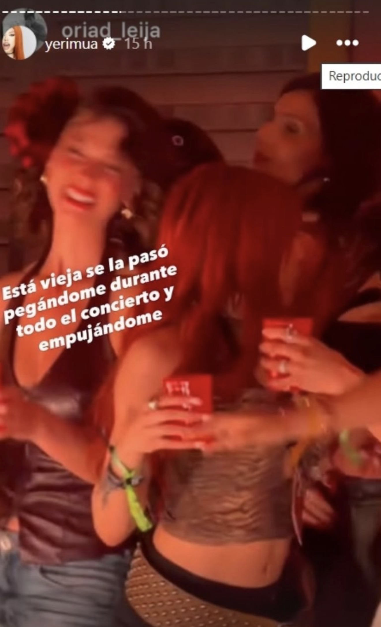 “Esta vieja de pelo chino, durante todo el concierto de Bad Bunny, se la pasó empujándome y metiéndome el pie para que me cayera. De verdad no sé cuál era su problema, pero desde que me vio se la pasaba molestándome”, expresó Yeri Mua en sus redes sociales, visiblemente molesta por lo ocurrido.