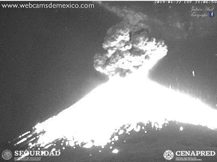 Este martes, en punto de las 21:06 horas, el volcán Popocatépetl registró una fuerte explosión que causó una columna eruptiva que alcanzó aproximadamente 2 mil metros de altura.
