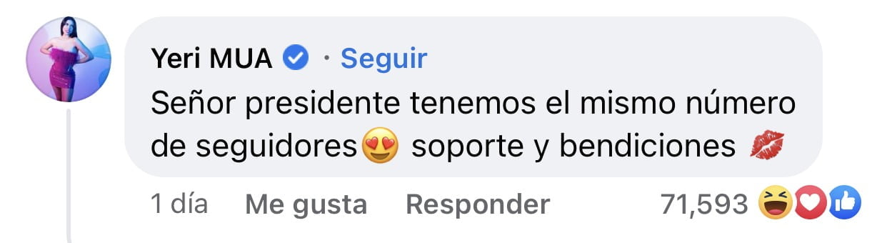 “Señor presidente tenemos el mismo número de seguidores😍 soporte y bendiciones 💋”, escribió Yerimua en Facebook.